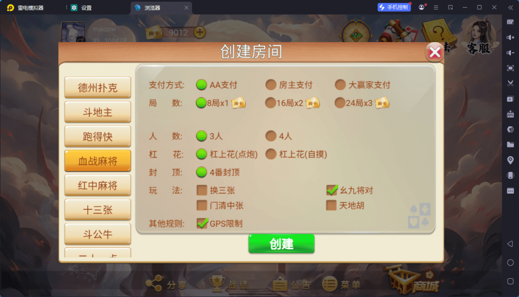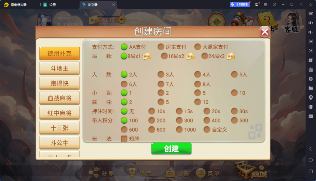 游戏:德州扑克,斗地主,斗公牛,福建十三水,红中麻将,跑得快,山西扣点点,十三张,血战麻将,炸金花
