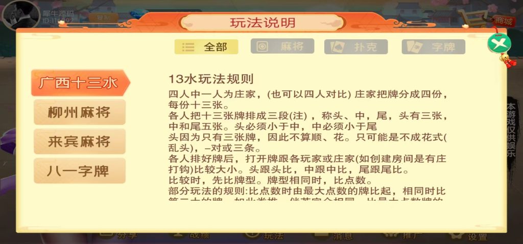 网狐系列广西玩法带占位机器人 站长 7月前更新 关注 私信 90210 注意!源码安装后,如发现有加密,授权,需要加某人QQ,请放弃使用,防止被骗!本站不会添加任何后门木马病毒。 源码资源教程内所需的工具一般工具区都有下载,请自行前往搜索下载 内置游戏:来宾柳州麻将 十三水 八一字牌。带占位机器人,服务端有授权。通用搭建教程广西玩法视频搭建教程 网狐系列广西玩法带占位机器人此内容为付费资源,请付费后查看¥99VIP免费SVIP免费登录购买付费资源 © 版权声明文章版权归作者所有,未经允许请勿转载。THE END房卡游戏游戏源码喜欢就支持一下吧点赞10 分享收藏0
