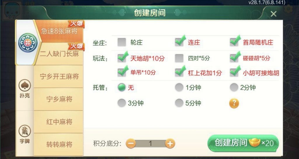 七星长沙地级市长沙麻将扑克字牌房卡端14子游戏+亲友圈乐豆模式+比赛模式+双端 站长 2年前发布 关注 私信 79611 注意!源码安装后,如发现有加密,授权,需要加某人QQ,请放弃使用,防止被骗!本站不会添加任何后门木马病毒。 源码资源教程内所需的工具一般工具区都有下载,请自行前往搜索下载 麻将:急速8张麻将,二人缺门长麻,宁乡开王麻将,宁乡麻将,红中麻将,长沙麻将,转转麻将 扑克:11张跑得快,跑得快,斗地主,三打哈,新三打哈 字牌:六胡抢,宁乡跑胡子 七星长沙地级市长沙麻将扑克字牌房卡端14子游戏+亲友圈乐豆模式+比赛模式+双端此内容为付费资源,请付费后查看¥499VIP¥299SVIP免费登录购买付费资源 © 版权声明文章版权归作者所有,未经允许请勿转载。THE END房卡游戏游戏源码喜欢就支持一下吧点赞11 分享收藏0